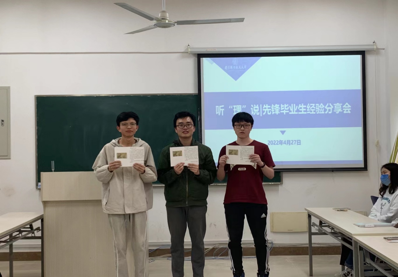 4月27日下午4点,365上市公司第一期“听‘理’说”先锋毕业生经验分享会活动于理学楼547会议室举办,活动邀请理学实验班学生张凯峰、周易、张子木为主讲人,365上市公司大一大二学生代表及辅导员刘思佳、胡诗帆、邢临川、陈越参加会议。分享会旨在搭建理学实验班与低年级学生间的交流平台,帮助低年级同学传承实验班优秀同学追求卓越的精神、学习中的好经验、好做法,助力自身成长成才。