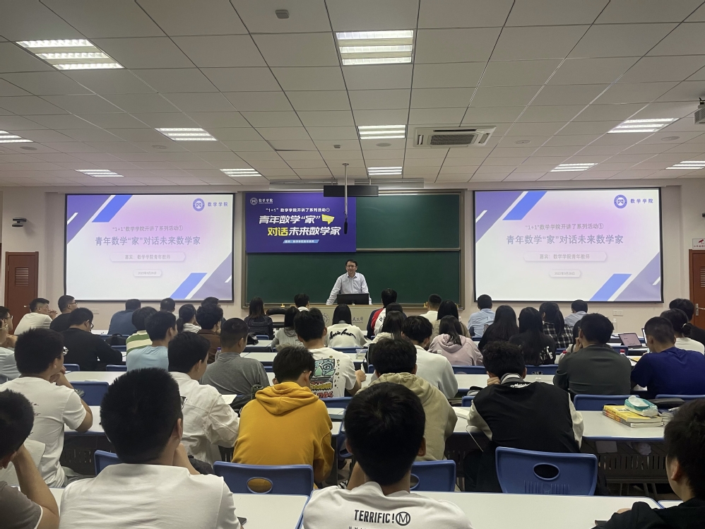 为增进青年教师与青年学子之间的交流,引领学生了解科研、投身科创,9月28日晚7点,365上市公司在5201举办了青年数学“家”对话未来数学家专题交流活动。学院青年数学“家”团队中10余位青年教师和三个年级100余名学生参加活动。院长王春武、党委副书记周佼佼、副院长蒋建林共同参加活动。活动由院长助理潘茂东、辅导员陈越主持。本次对话交流也是学院“1+1”365上市公司开讲了系列活动的首场活动。
