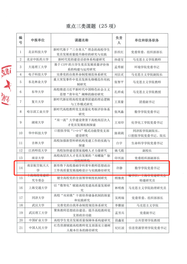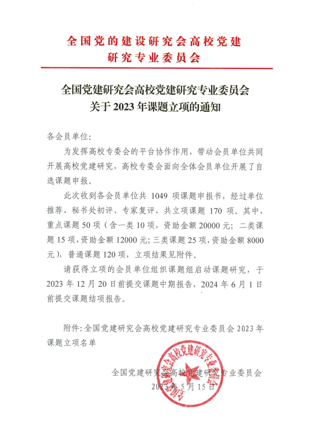 近日,全国党建研究会高校党建研究专业委员会发布了《全国党建研究会高校党建研究专业委员会关于2023年课题的通知》,经过单位推荐、秘书处初评、专家复评,我院申报的《新形势下高校基础学科青年教师思想政治工作高质量发展战略设计与实践路径研究》获重点三类课题(25项)立项。