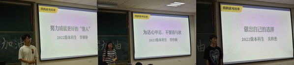 在“我的高考故事”分享环节,三位同学以朴实动人的话语,讲述了自己的高中的故事。李柳铮讲述着自己的高考动力来自于想通过自己努力让身边人过得更好的决心。李伶俐同学讲述了自己“为达心中志,不懈春与秋”的故事,因缺乏自制力导致成绩滑坡后,不甘落后的她奋起直追,最终一点点的将自己失去的意志力和良好学习习惯拾起来。关梓杰同学回忆了自己在高三时候做的重要选择:不能继续昏沉下去,要清醒起来,这段经历让他对选择有了更深理解:选择本身就是自我改变的开始!