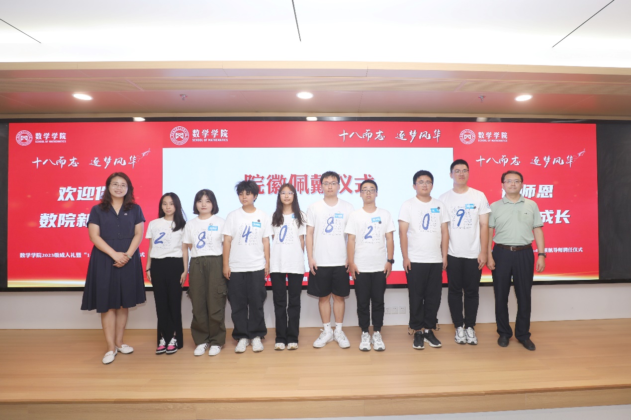 随后,许静、王春武为2023级新生代表佩戴院徽,各“1+4“领航导师为对接宿舍同学佩戴院徽,解锁同学们数院人的新身份,传递数学人的使命担当。小小的的院徽寄托着学院与老师们满满的期待,同学们将院徽佩于胸,将教导记于心,在新征程上踔厉奋发、勇毅前行。