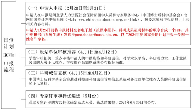 根据《全国博士后管委会办公室中国博士后科学基金会关于开展2024年度国家资助博士后研究人员计划(含博士后创新人才支持计划)和博士后科研业绩评估考核资助申报工作的通知》(博管办〔2024〕32号),自2023年起,国家资助博士后研究人员计划将按照“个人申报、单位推荐、专家评审、择优资助”的原则实施分档分类资助。为做好我校2024年度国资计划的申报遴选工作,现就有关事项通知如下: