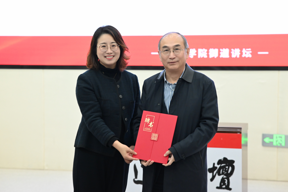 讲座现场,许静为刘灿铭颁发聘书,聘请刘老师为学院“思政导师”。
