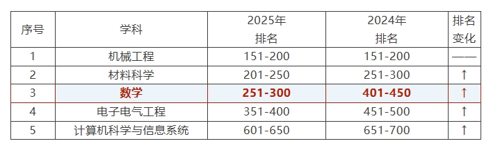 2025年3月,国际高等教育研究机构QS(Quacquarelli Symonds)正式发布第15版QS世界大学学科排名。本次排名包含艺术与人文、工程技术、生命科学与医学、自然科学、社会科学与管理学五大学科领域,涵盖55个具体学科,对全球100个国家和地区的1700多所大学进行独立的比较分析。我校共有5个学科上榜,分别是机械工程、材料科学、数学、电子电气工程、计算机科学与信息系统。