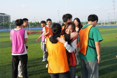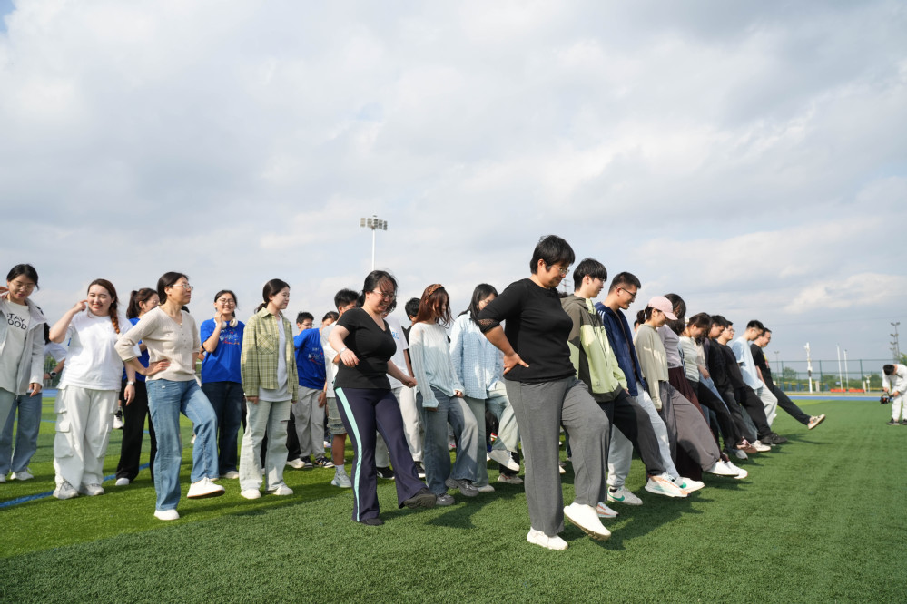 开场环节气氛热烈,师生们混合组成5支参赛队伍。各队在破冰环节集思广益,制定出创意十足的队名和响亮的口号。随后,全体人员跟着教练进行热身,通过团队协作完成指定动作,现场欢声笑语不断。