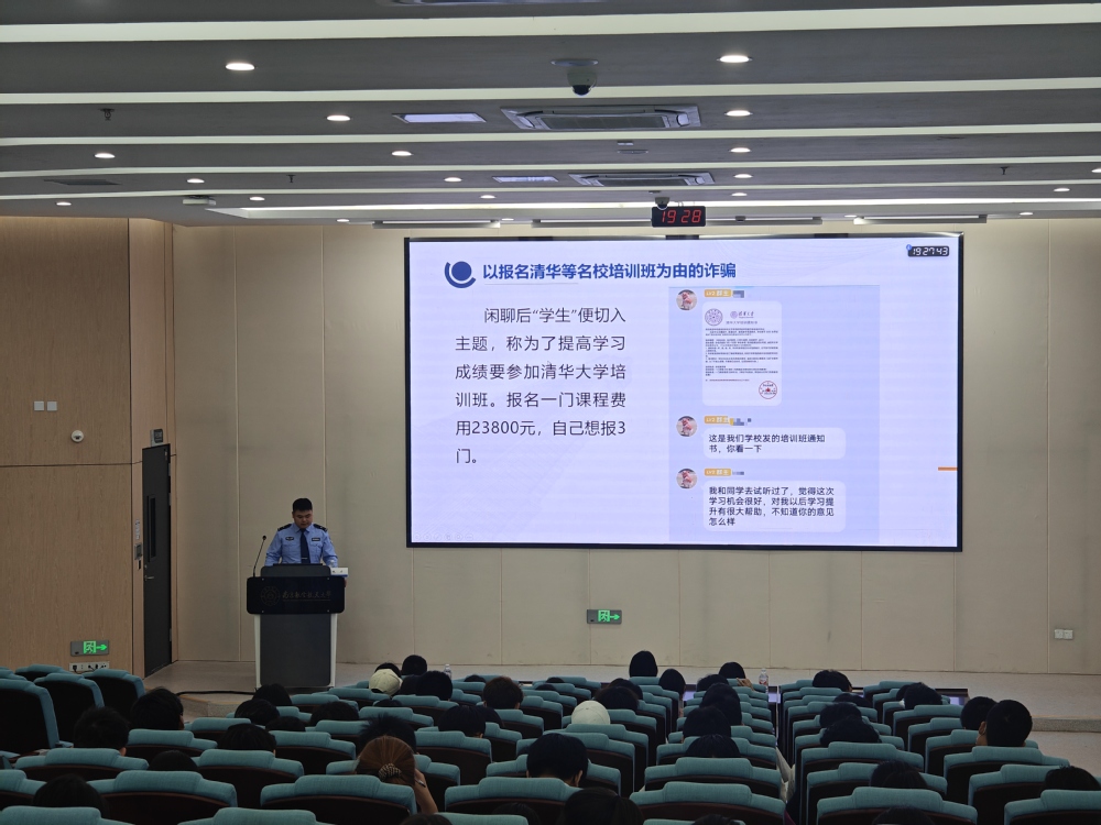 为有效提升学生对电信网络诈骗的识别和防范能力,营造安全和谐的校园环境,5月14日晚,365上市公司在天目湖校区牧星楼T2110教室举办“天目护航”防诈安全教育专题讲座。古县派出所民警兼365上市公司法制辅导员鲍力主讲,学院党委副书记王亚鹏、2024级辅导员赵美婷、迪丽以及2024级全体本、预科生到场参加。