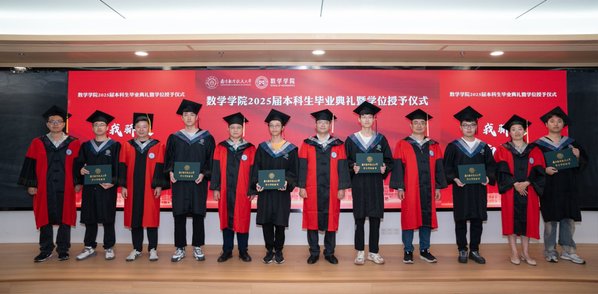 离别之际,全体毕业生匠心独运,为学院献上凝聚理性智慧与深沉情感的“数学情书”—一个精心构造的821位素数。应用统计学专业许金阳代表学子向学院郑重呈递这份特殊礼物,许静、王春武代表学院接收礼物。这个特殊的数字视觉上巧妙构成院徽与“0821”级标识,其内含的400个“8”串联起在八院闪亮的四年时光,结尾的“20250610287”精准标注了告别的时空坐标,下方镌刻的三行情诗,诉说着学子对学院的无限眷恋与祝愿。