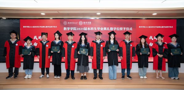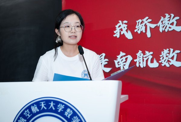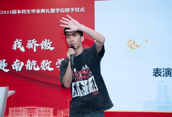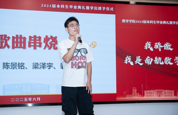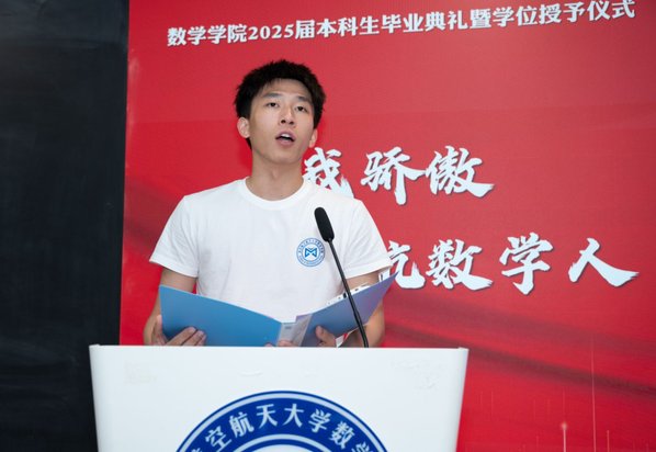四位毕业生代表依次上台发言,保研至中国人民大学的余朝阳分享初入校园参与竞赛及大创项目的追梦经历,表示将带着南航精神走进统计学顶尖学府;入职中国商飞的肖秀灿许下青春誓言,立志要将个人理想融入国家理想、用数字守护祖国蓝天的青春誓言;升学本院的李彦锋以考研奋斗历程为例,讲述了绩点普通的自己在砥砺中收获成就、实干中提升本领的青春故事;保研至浙江大学的陈昊哲分享了本科期间推开理工融合大门的经历,鼓励同学跳出舒适圈、在实践中锻炼数学能力、开拓无限可能,表达了对学院培养的诚挚感恩。