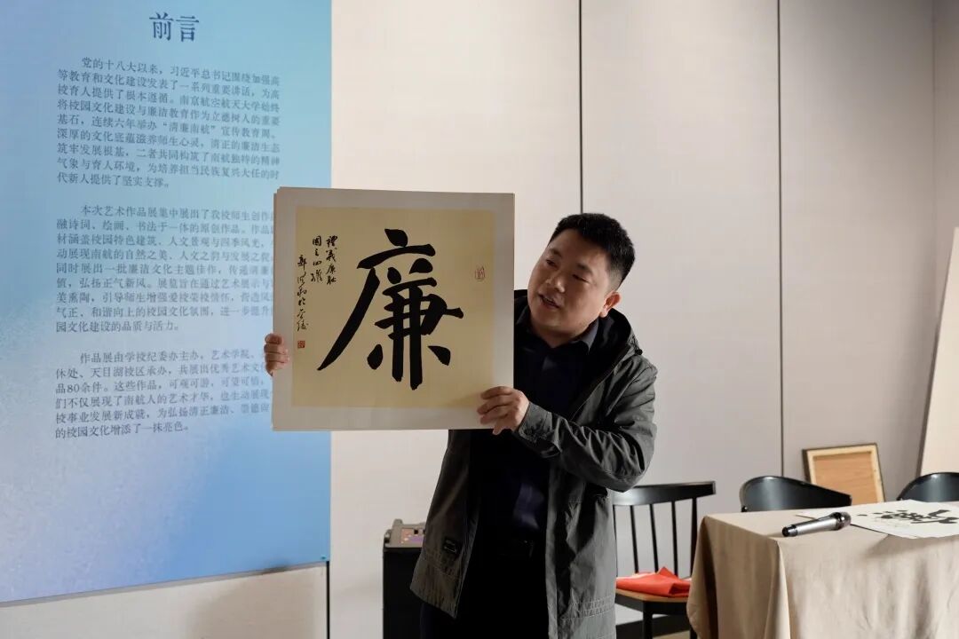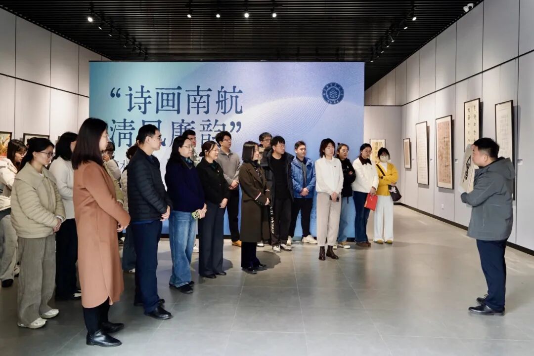 随后,师生党员在郭洪豹的讲解下,集体走进“诗画南航,清风廉韵”艺术作品展,沉浸式观“廉”。本次展览是第六届“清廉南航”宣传教育周重点活动,由学校纪委办主办,艺术学院、离退休处、天目湖校区联合承办,集中展出我校师生原创作品80余件,展品聚焦廉洁主题,以笔墨丹青传递清廉价值、弘扬正气新风。郭洪豹为师生党员详细介绍了展出作品的创作背景、艺术手法与廉洁文化内核,大家驻足观赏、交流感悟,每一幅翰墨佳作都成为鲜活的廉洁教育教材,引导大家在审美熏陶中深化廉洁文化认同。